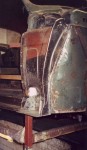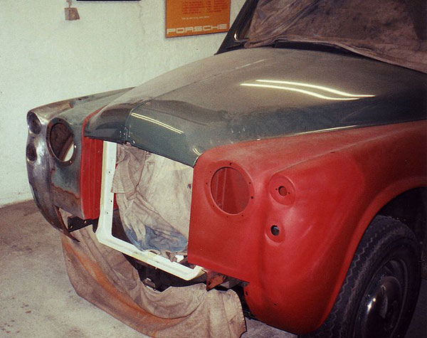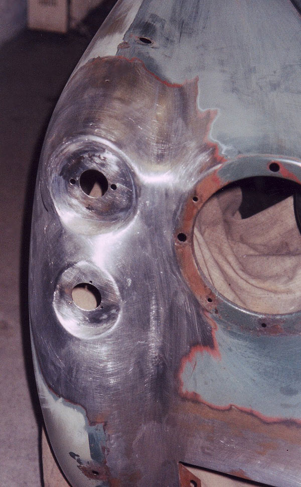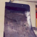 Der Kotflügel eines P4 besteht aus 7 zusammengeschweißten Einzelteilen. Das vordere Stück, in dem sich die Beleuchtungs- und Signaleinheiten befinden, sowie die seitliche Außenhaut sind werksseitig stumpf geschweißt. Aber gerade an punktverschweißten, überlappenden Blechen bildet sich oftmals die Ausgangsbasis für Rostbefall. Folglich zerlegte ich die Kotflügel in ihre Einzelteile, sandstrahlte die überlappenden Bereiche und verschweißte sie anschließend wieder. Zum vorbeugenden Rostschutz wurde an der Schweißstelle eine zinnhaltige Schweißpaste verwendet. Anschließend trug ich zusätzlich, verdünnte Rostschutzfarbe am Restspalt der Schweißstelle auf, bis sie auf der Rückseite des überlappenden Blechbereiches wieder herauslief. Das gewährleistet einen langjährigen Korossionsschutz. Beide Kotflügel wurden später sandgestrahlt, spritzverzinkt und aluminiumbeschichtet.