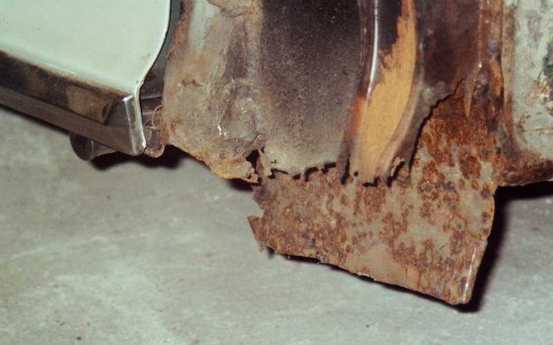 Ein weiterer Rostherd am Tantchen ist das magische Dreieck – der Bereich, an dem Spritzwand, A-Säule, Kotflügel und Trittbrett aufeinander treffen. Dort befindet sich einer der wenigen Hohlräume am Fahrzeug. Häufig ist der werkseitige Wasserablauf verstopft- mit unangenehmen Folgen.