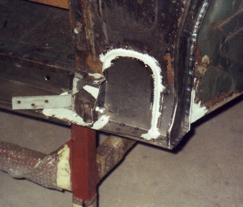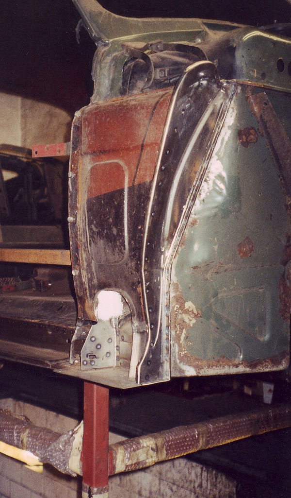 Die fachgerechte Reparatur dieser Sektion war sehr zeitaufwendig und schwierig. Eine stattliche Anzahl kleiner Blechsegmente sorgte für viel Arbeitsaufwand. Außerdem musste ein an dieser Stelle vorhandenes Türscharnier exakt positioniert werden, damit später der passgenaue Einbau der Tür gewährleistet war. Ich entschied mich für diesem Bereich gegen die Verwendung erhältlicher Reparaturbleche und fertigte alle Blechteile- neun pro Seite- mit eigener Hand nach.