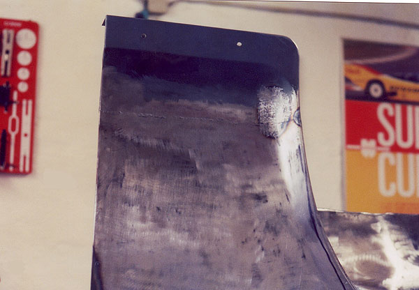 Zwei typische Schwachstellen an einem P4-Kotflügel sind die Bereiche um die Signaleinrichtungen, sowie die unteren Abschlüsse am Ende des Kotflügels. In beiden Fällen schweißte ich aus England importierte Reparaturbleche auf Stoß im Autogenschweißverfahren ein. Die Autogen-Naht hat einen handfesten Vorteil. Im optimalen Fall verschmelzen die Bleche nur durch das verflüssigen der Kanten dauerhaft miteinander. Die entstehende Schweißnaht besteht aus demselben Material wie das eigentliche Blech und versprödet nicht. Anschließend - den notwendigen Platz vorausgesetzt – lassen sich kleinere Verwerfungen mühelos mit handelsüblichen Ausbeulwerkzeugen glätten.