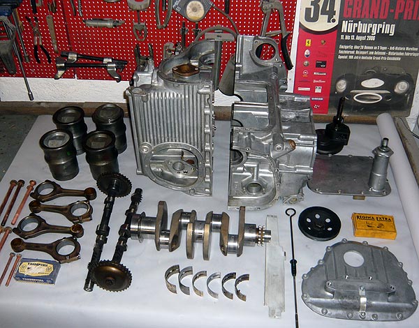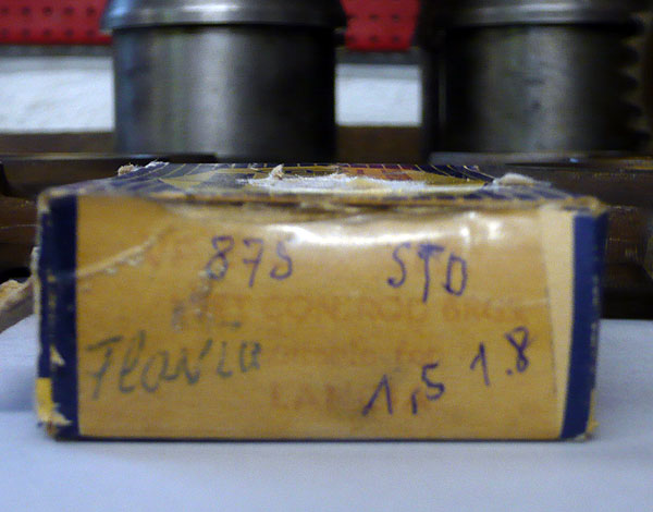»Das dunkelste Kapitel einer Flavia fängt im Ersatzteillager an«,weiß jeder Flavia-Besitzer. Und 4497 machte an dieser Stelle keine Ausnahme. Einige Ersatzteile sind nur schwer erhältlich und werden in Gold aufgewogen. So war ich glücklich, dass ich aus dem Ersatzteilfundus des Fahrzeugeigentümers auf neue Kolben, Laufbuchsen, Haupt- und Pleuellager zurückgreifen konnte. Auch wenn der Zahn der Zeit seine Spuren an den Verpackungen hinterlassen hatte, und deren Inhalt für die Montage besonders sorgfältig aufbereitet werden musste.