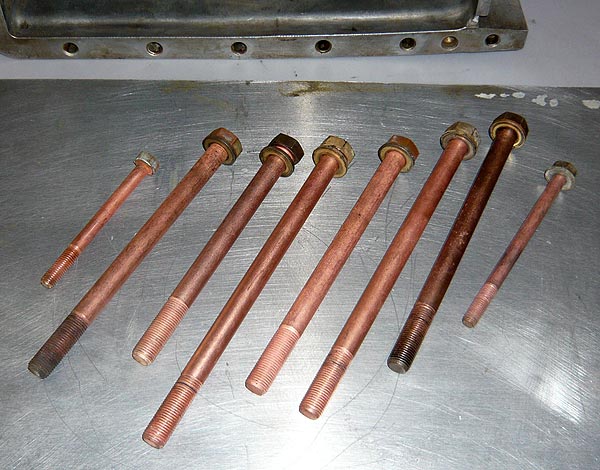 Die Montage begann mit dem Austausch der Lagerschalen und Anlaufscheiben der Kurbelwelle in den jeweiligen Motorblockhälften, die anschließend miteinander verschraubt wurden. Zu meiner Freude verfügte die Oberfläche der Schrauben für den Motorblock über eine galvanische Kupferbeschichtung. Somit ist Kontaktkorrosion zwischen den unterschiedlichen Metallen von Triebwerk und Verschraubungsmaterial ausgeschlossen; von fundamentaler Bedeutung, da die Bolzen von 4497 zusätzlich noch direkt vom Kühlwasser umspült werden.
