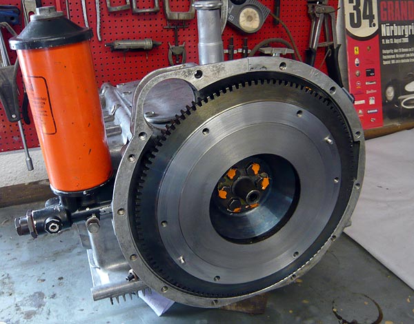 Nachdem alle Deckel am Motor, der Anlasser und der Verteiler montiert waren, befüllte ich das Triebwerk mit Öl und schloss ein Öldruckprüfmanometer an. Schon auf der Werkbank baute ich den Öldruck auf und nahm eine Kompressionsmessung vor. So überprüfte ich bereits vor der Endmontage der Motornebenaggregate und dem Einbau des Triebwerkes, ob die durchgeführten Arbeiten am Motorblock und den Zylinderköpfen erfolgreich verlaufen waren.