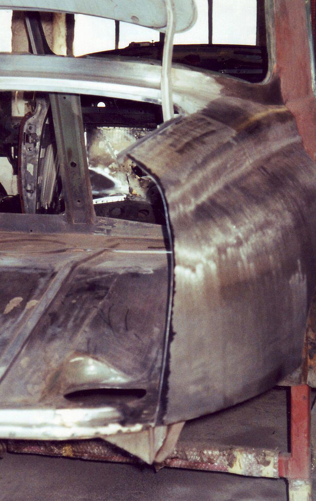 In der Vergangenheit hatte der Rover einen Heckschaden erlitten. Nachdem der Unterbodenschutz in den Radhäusern und der Lack vom linken Seitenteil entfernt waren, traten die Sünden vergangener Tage deutlich zum Vorschein. Das Radhaus war durch kunstvoll übereinander geschweißte Aufsatzbleche, das Seitenteil durch dicke Schichten verschiedener Spachtelsorten wieder in Form gebracht worden. Der 3mm starke Haltewinkel, an dem die Karosserie am Rahmen verschraubt wird, war verzogen, die ursprüngliche Aluminium-Kofferraumklappe gegen eine Stahlausführung getauscht. Jedes vorhandene Blechteil im hinteren Bereich war durch den Unfall in Mitleidenschaft gezogen. Zudem wurde die unprofessionelle Instandsetzung ausgeführt, ohne den Karosserieaufbau vom Rahmen getrennt zu haben.