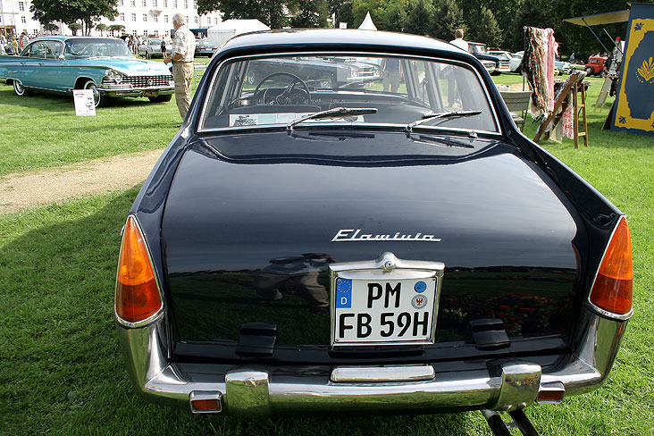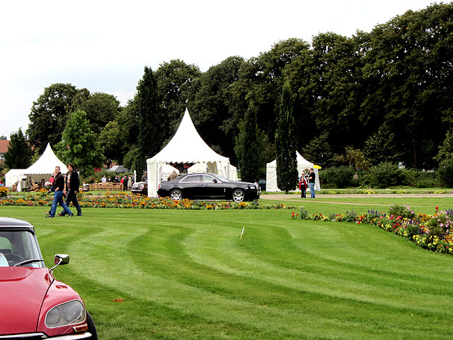 Bereits am Samstag hatte ich mit einem Bekannten in seinem Alfa Romeo Giulietta Sprint von 1960 die Schau besucht. Leider waren an diesem Tag wegen des regnerischen Wetters nur wenige Fahrzeugbesitzer und Besucher gekommen. Aber am Sonntag badeten bei 30 Grad geradezu die auf Hochglanz polierten Oldtimer in der spätsommerlichen Sonne. Auch sehr zur Freude der in Scharen gekommenen Besucher, die in dem weitläufigen Schlosspark zwischen den fahrbaren Raritäten flanierten. Apropos Park: Auf 250.000 m² wurde hier zur Landesgartenschau 2009 eine wahre Traumlandschaft direkt an der Havel geschaffen. Das richtige Ambiente also für eine Schau eleganter Automobile.